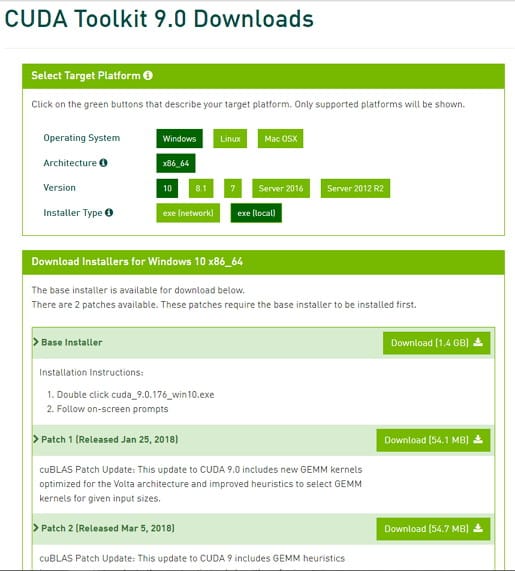 - 링크를 클릭해서 CUDA 9.0을 다운로드 후 설치한다. [다운로드링크]