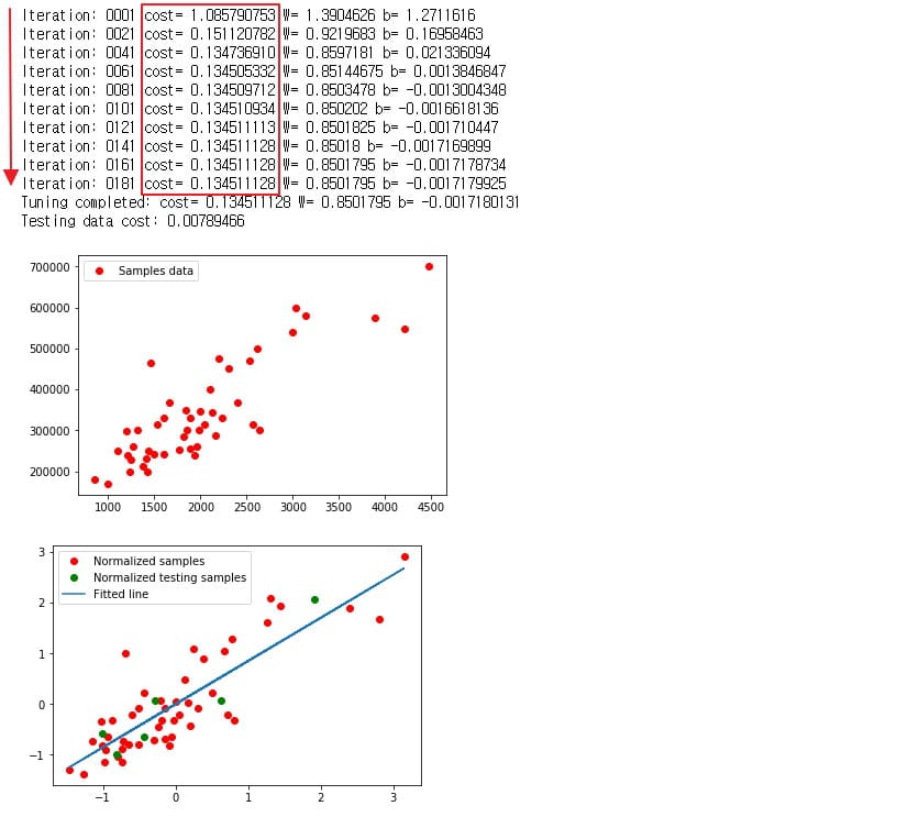 feed_dict={X:size_data_n, Y:price_data_n})),"W=", sess.run(W), "b=", sess.run(b))
