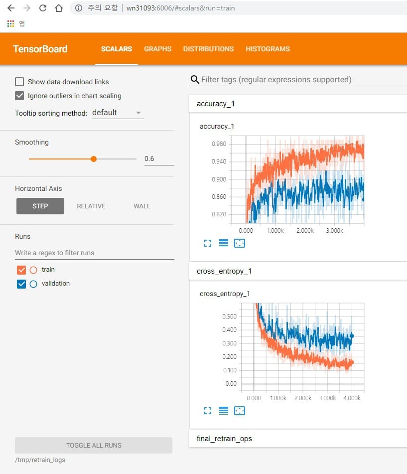 2) 학습 중간에 학습이 진행되는 과정을 보고자 하면 Tensorboard 를 실행하여 event 분석그래프를 보면 된다.