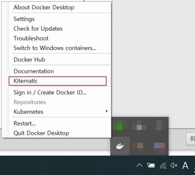 - 설치 후 우측 아래의 고래 아이콘 클릭 후 툴바에 나오는 kitematic을 클릭하면 다운로드 창이 뜬다.