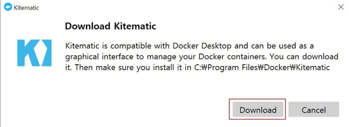 - 다운로드를 클릭하면 zip파일로 내려받아지는데 압축을 풀고 Kitematic폴더를 바로 위 메시지에서