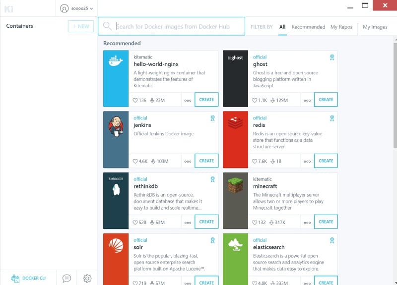 - 그런다음 우측 아래의 고래 아이콘 클릭후 나오는 툴바의 Kitematic을 클릭하면 아래와 같은 툴이